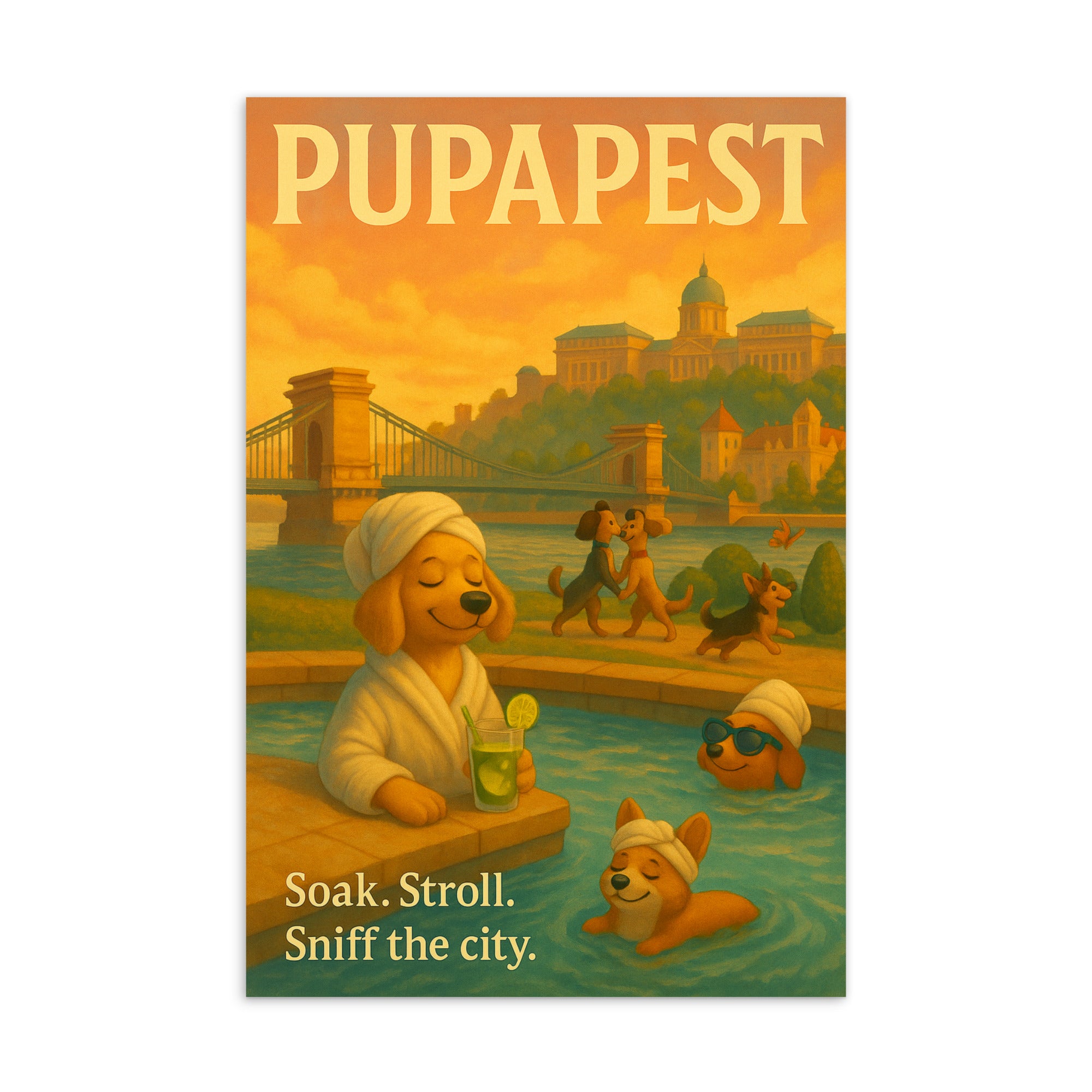 This Budapest-inspired 4x6 postcard features pups roaming the grand boulevards, thermal spots, and riverside paths of Hungary’s capital. With historic splendor and tail-wagging personality, Pupapest captures the magic of a city where dogs stroll like royalty.