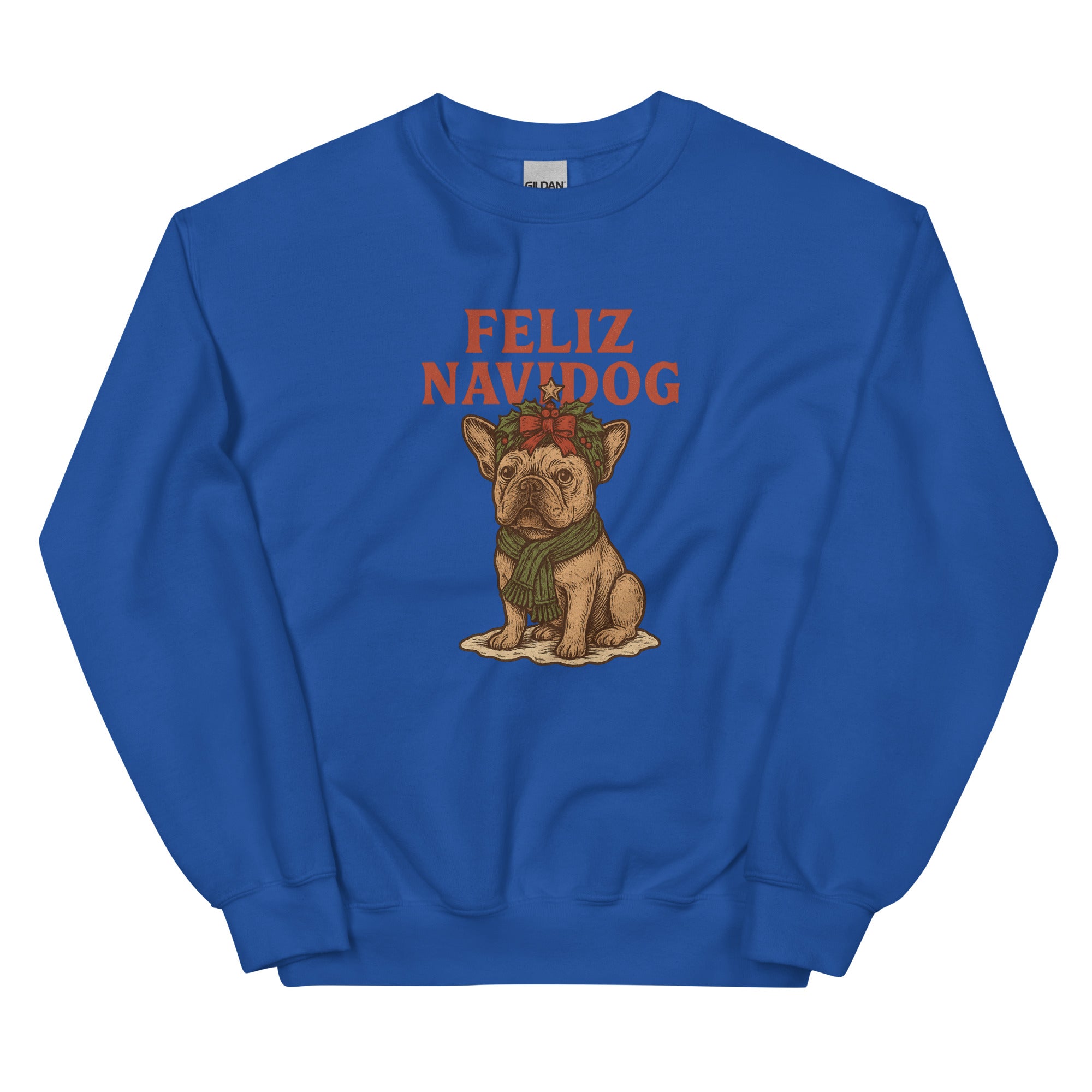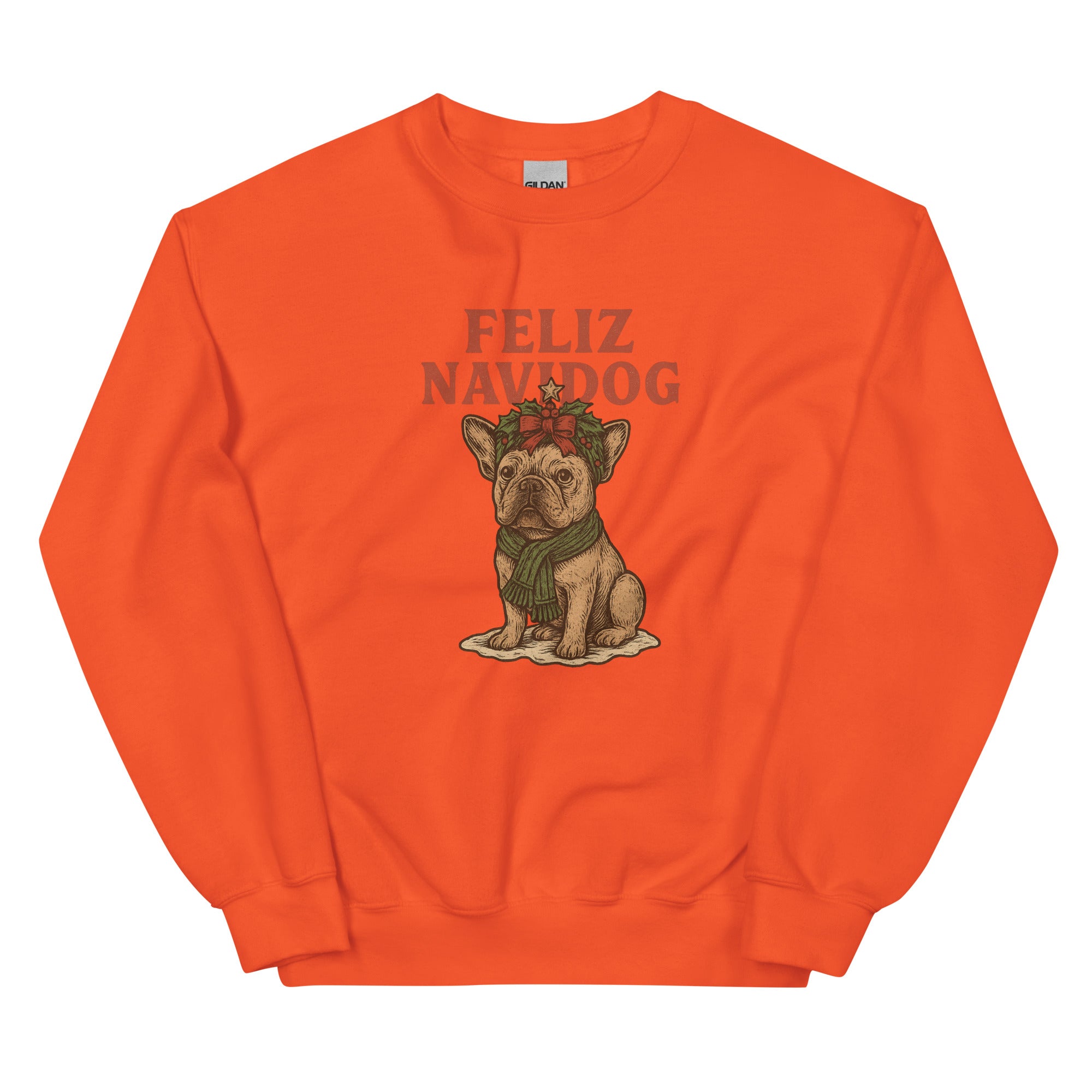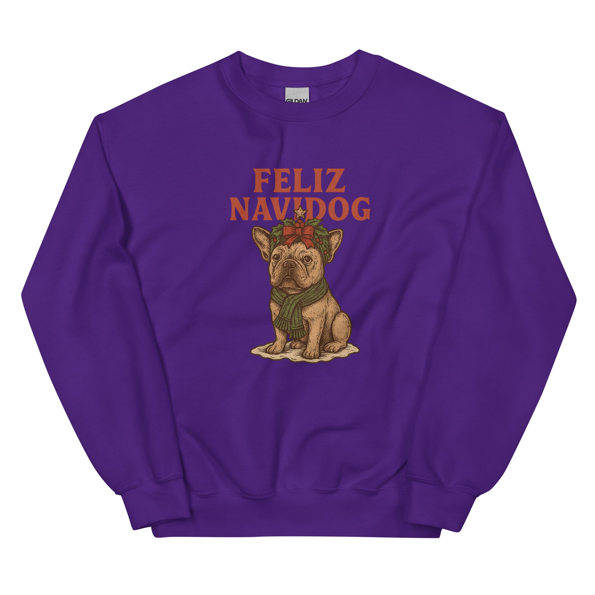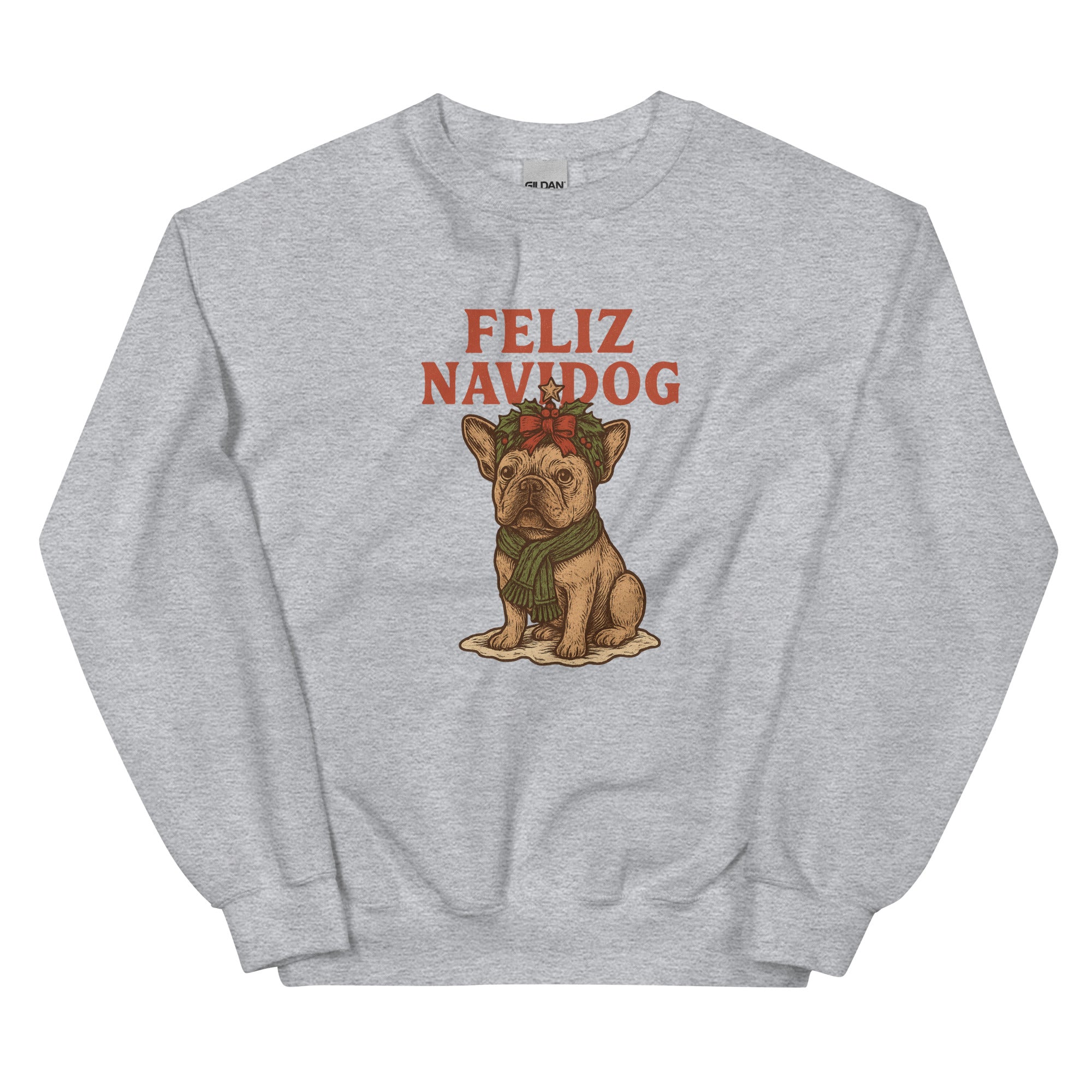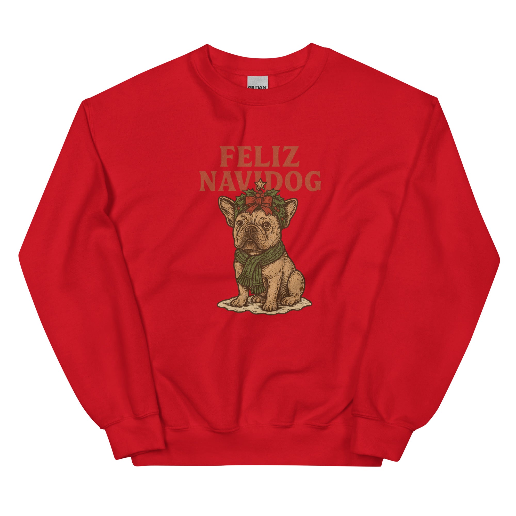 Wish your pack a Feliz NaviDOG in cozy, festive style! This warm and whimsical holiday sweatshirt features a sort of cheerful pug ready to sleigh the season with bilingual bark and yuletide flair.