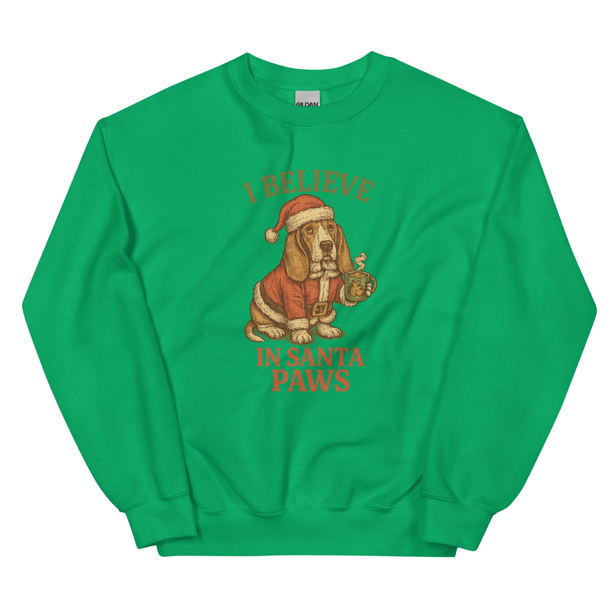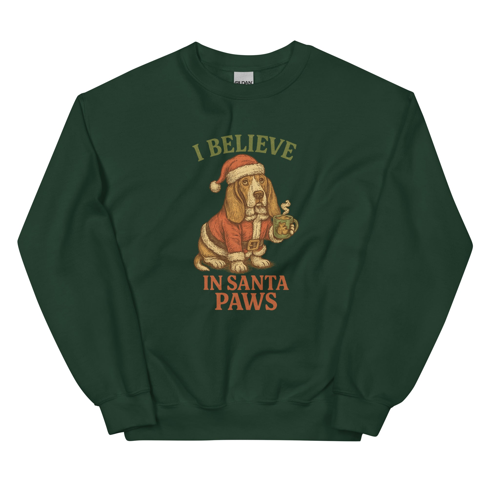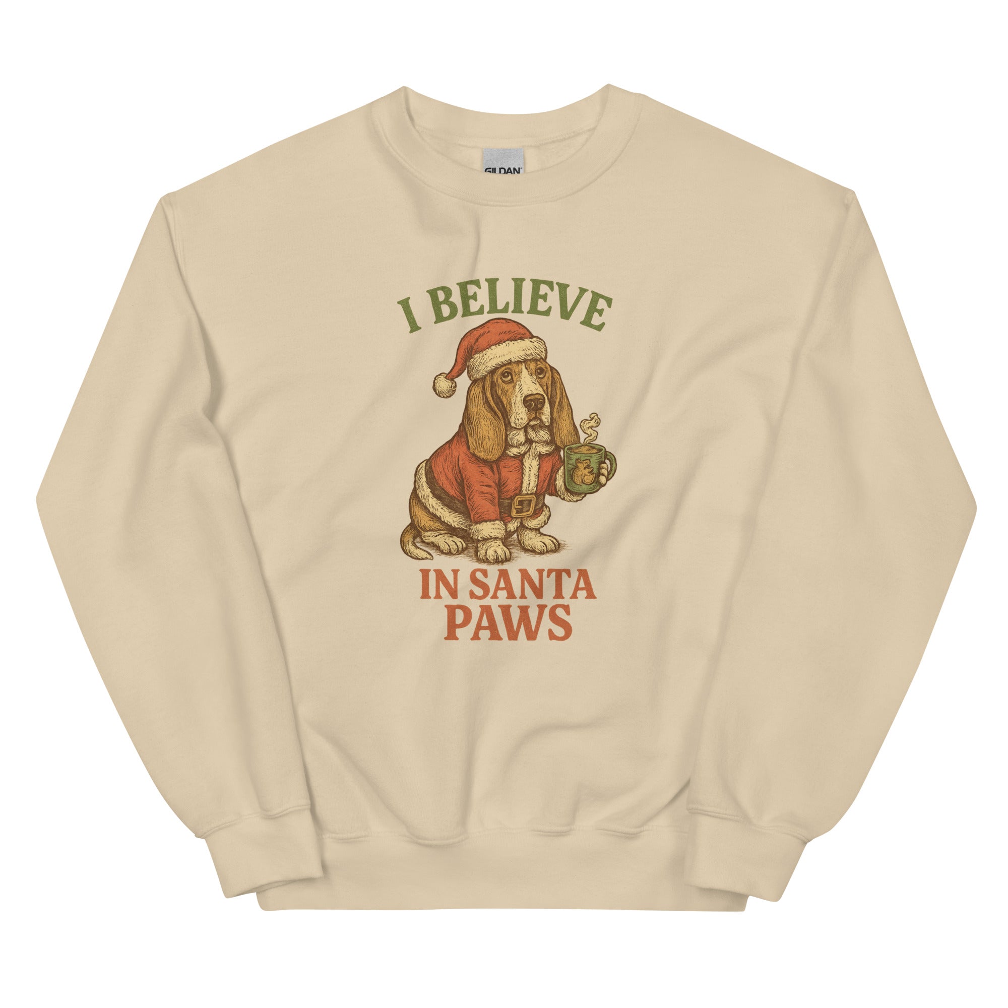 Warm your heart (and your paws) this holiday season with our cozy “I Believe in Santa Paws” sweatshirt! Featuring a sort of jolly bloodhound in a Santa hat, this festive pullover is perfect for decking the halls, walking the dog in style, or cuddling by the fire with your favorite furry friend.