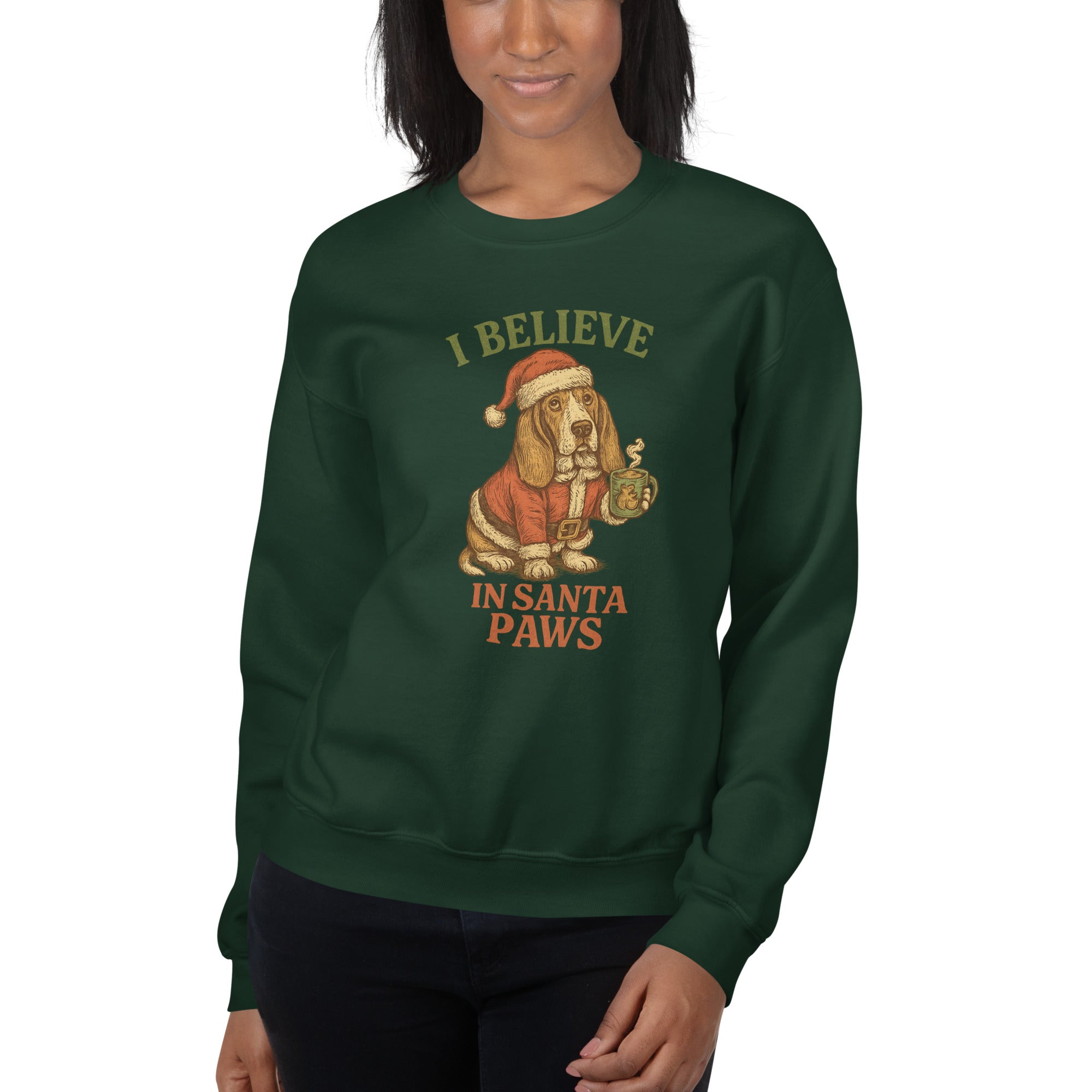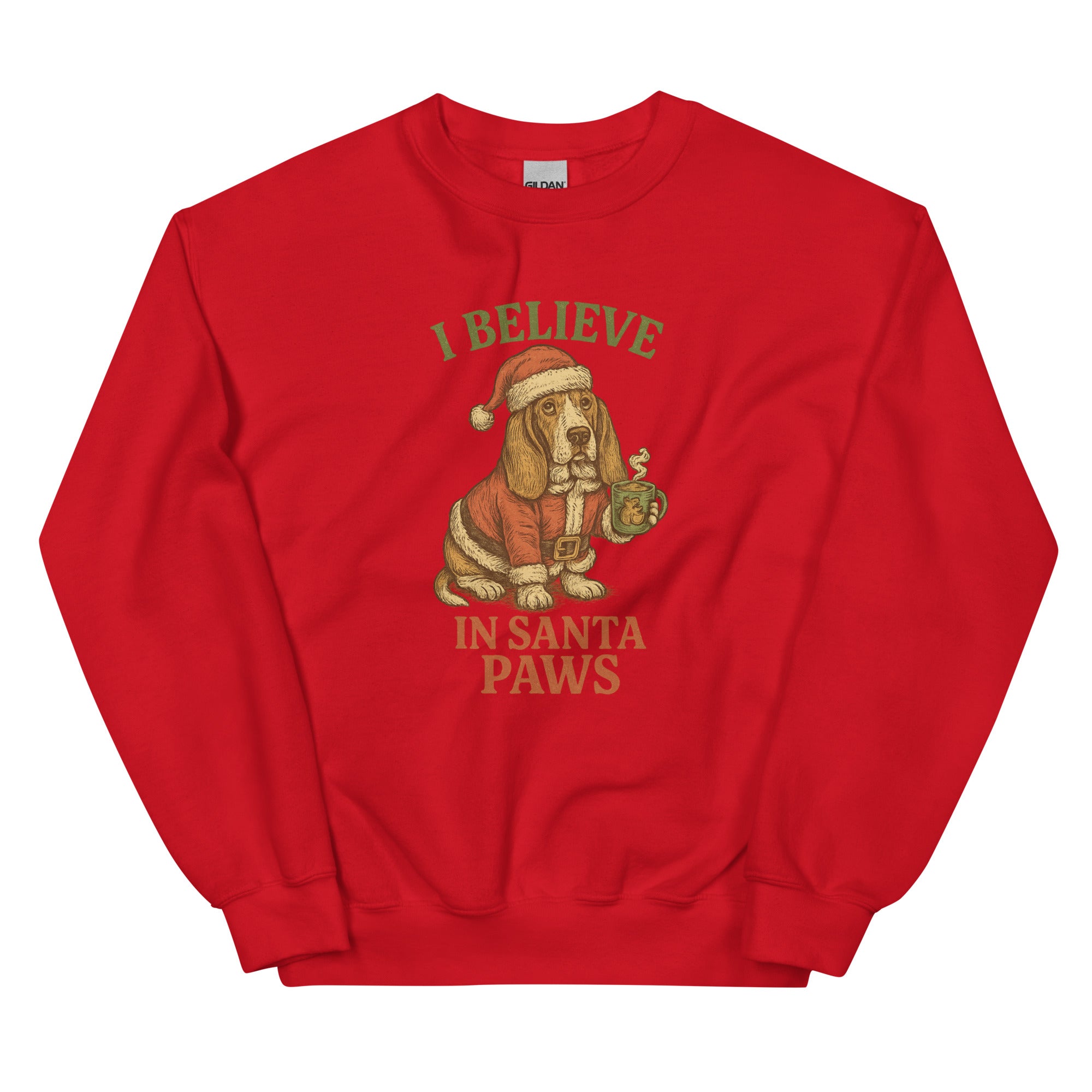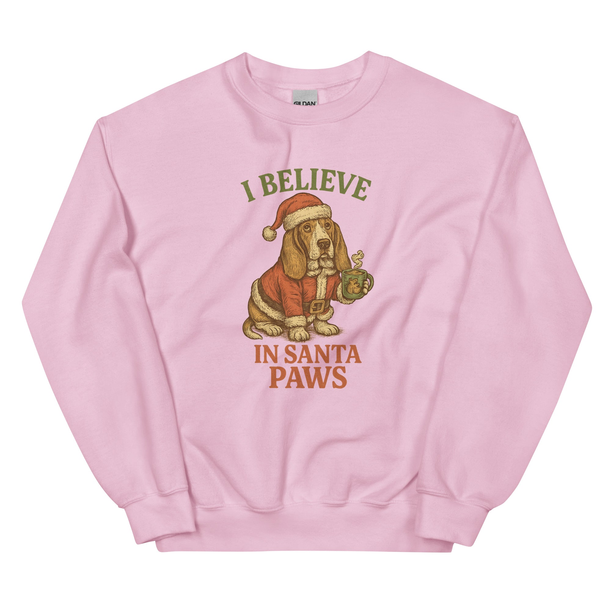 Warm your heart (and your paws) this holiday season with our cozy “I Believe in Santa Paws” sweatshirt! Featuring a sort of jolly bloodhound in a Santa hat, this festive pullover is perfect for decking the halls, walking the dog in style, or cuddling by the fire with your favorite furry friend.