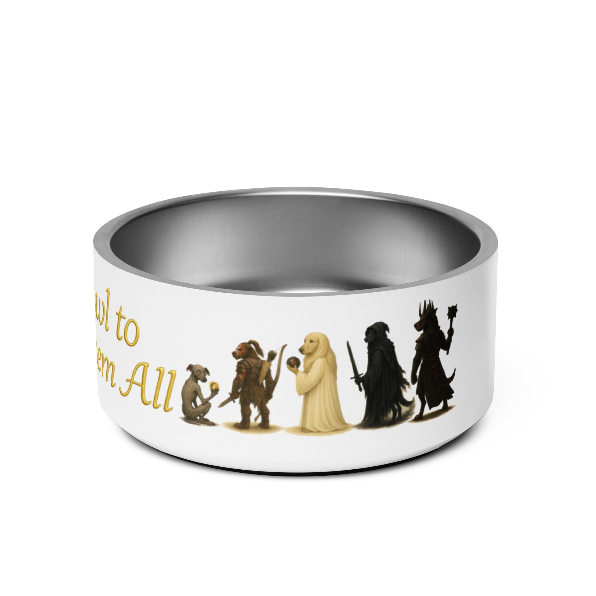 This "Lord of the Rings"-inspired parody pet bowl is designed for furry adventurers who know the true power of a good meal. Featuring the phrase “One Bowl to Drool Them All” in a golden Elvish-style font, this bowl turns every breakfast, lunch, and dinner into a Tolkien-worthy feast.