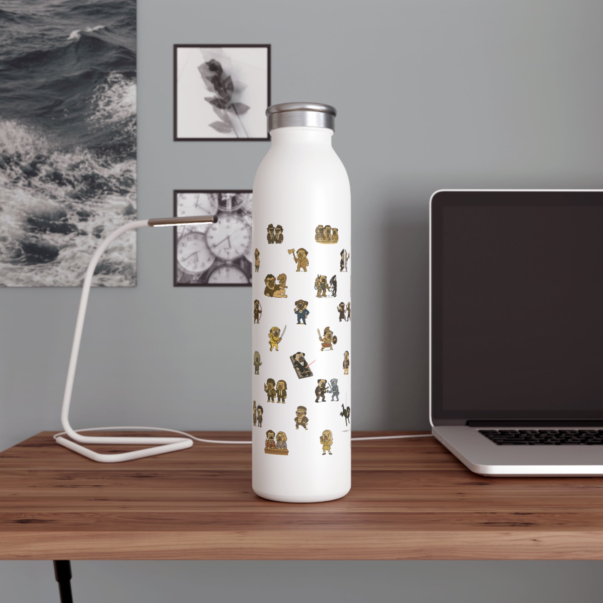 Lights, camera, hydration! This slim water bottle brings your favorite four-legged film icons to life in a playful design filled with adorable pug parodies of classic movies.
