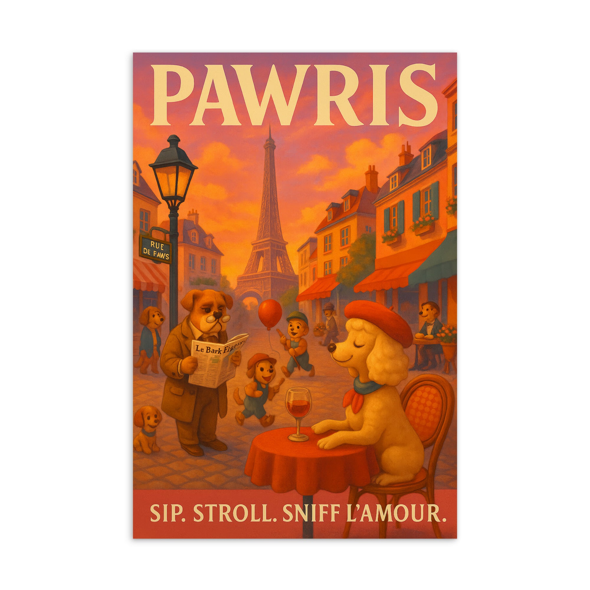 This vintage-style Paris-inspired 4x6 postcard features fashionable pups basking in the glow of the Eiffel Tower. Full of charm, chic, and canine charisma, Pawris is a must-have for travelers, dog lovers, and hopelessly romantic mutts.