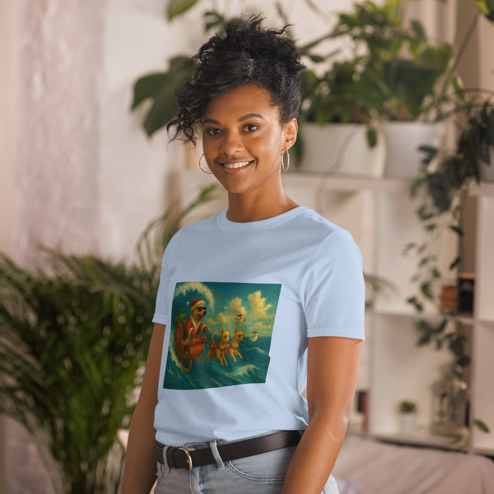 Santa Dog Surfing-Sleeve Unisex T-Shirt -- Funny Christmas Shirt for Dog Lovers